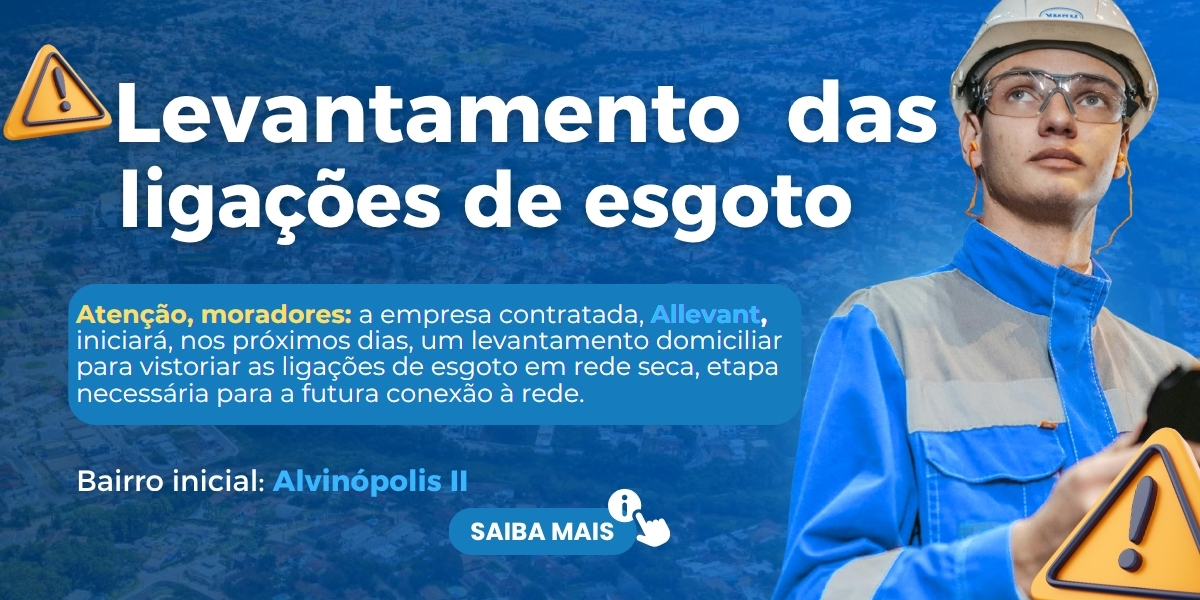 A SAAE Atibaia informa que, a partir de 10 de novembro de 2025 , as equipes da Allevant Engenharia e Consultoria, empresa contratada Atibaia Saneamento, a serviço da Saae, darão início ao levantamento em campo das ligações de esgoto , começando pelo bairro Alvinópolis II e, posteriormente, pelos bairros Jardim Cerejeiras e Jardim Imperial. Essas regiões são atendidas pelas Estações Elevatórias de Esgoto Onofre 3 e Onofre 4, e os serviços têm previsão de conclusão em julho de 2026.